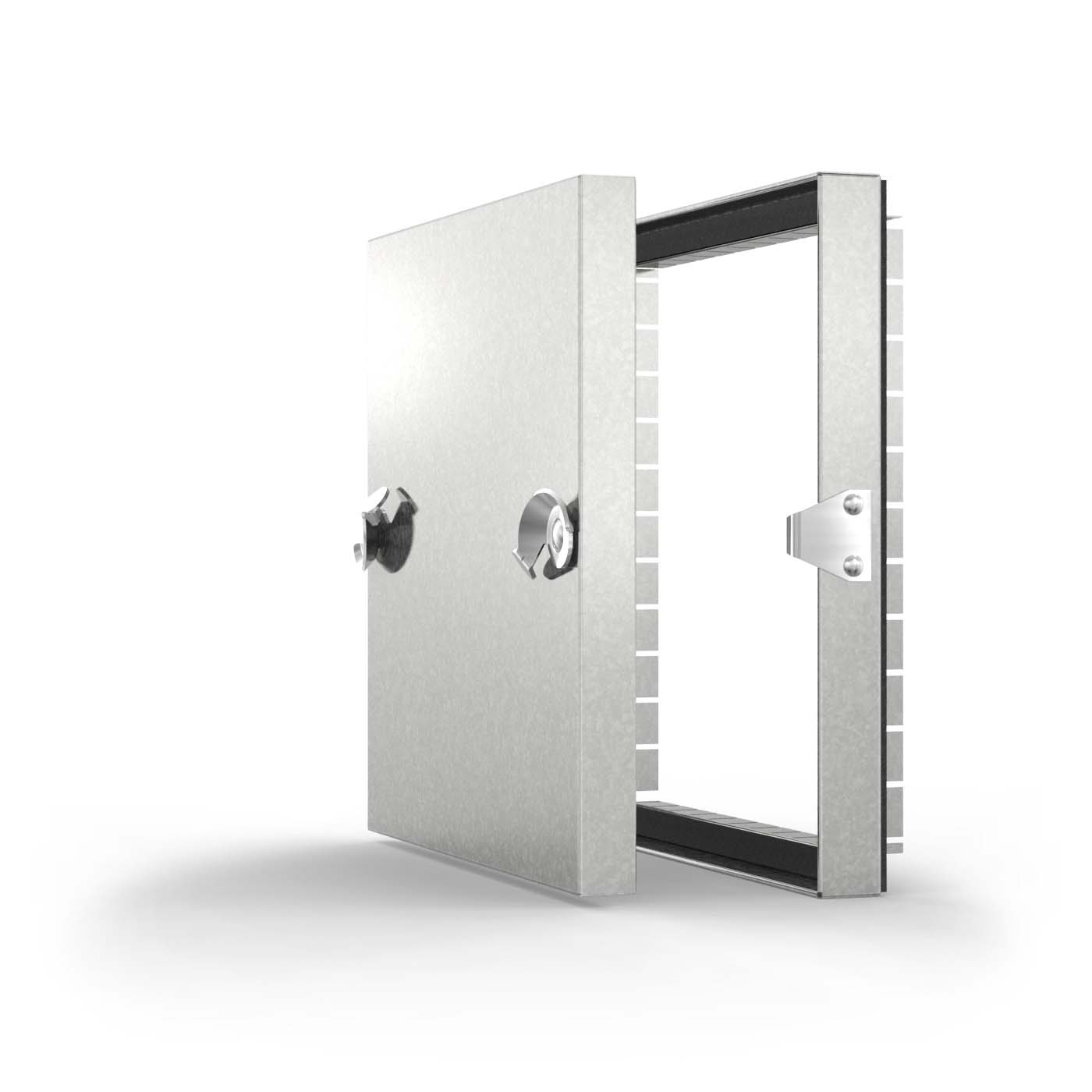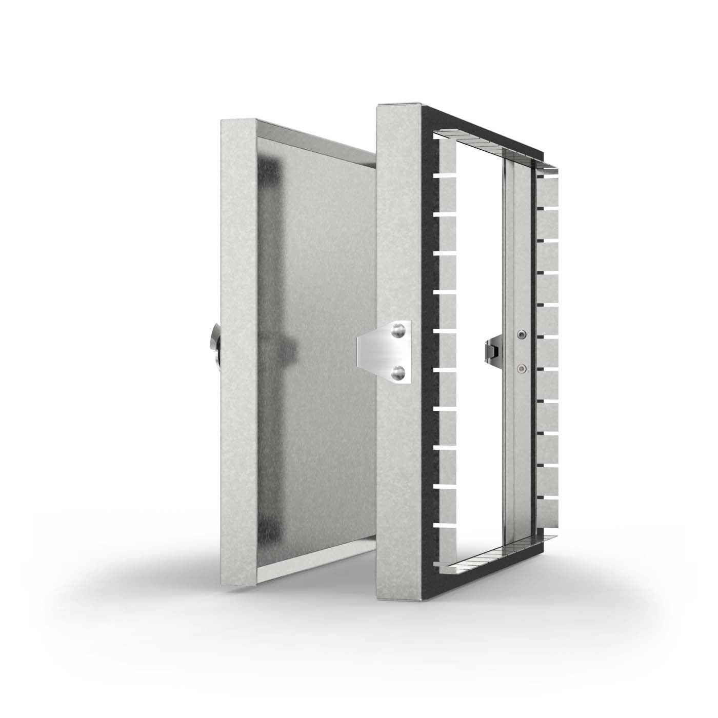 1/8 “thick by 1/2” wide closed-cell neoprene gaskets between door and frame and also between frame and duct