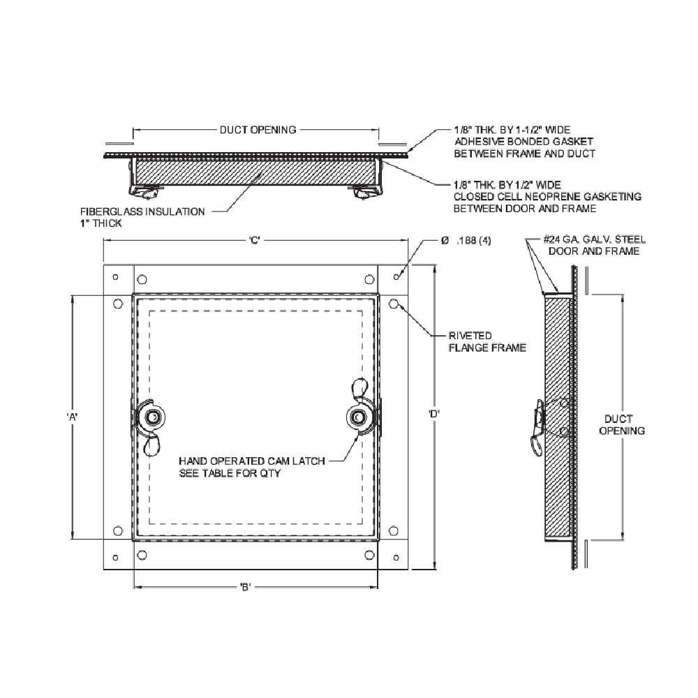 1/8 “thick by 1/2” wide closed-cell neoprene gaskets between door and frame. 1/8 “thick by 1-1/2” wide adhesive chipboard packaging between frame and duct.