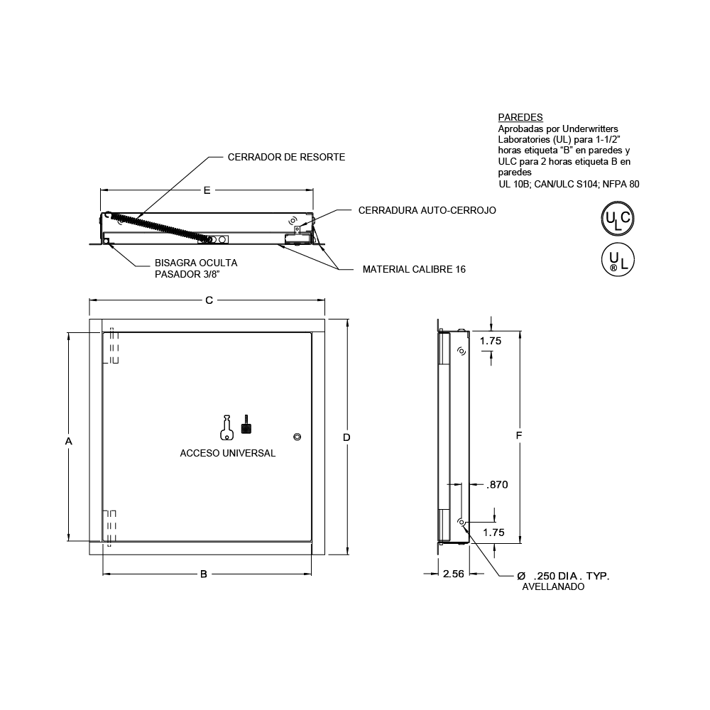 UL — 1-1/2 hours “B” label. UL — 2 hours “B” label. (optional) Maximum sizes 36 x 48 and 24″ x 79″