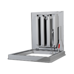 Automatic arm open and held with red vinyl handle to open at 90 degrees, locking the door in the open position and allowing easy control when closing the door panel. When required, stainless steel compression rings can be provided to add support for lifting. Available with electric actuators, operated by a wall-mounted push-button switch and remote control.