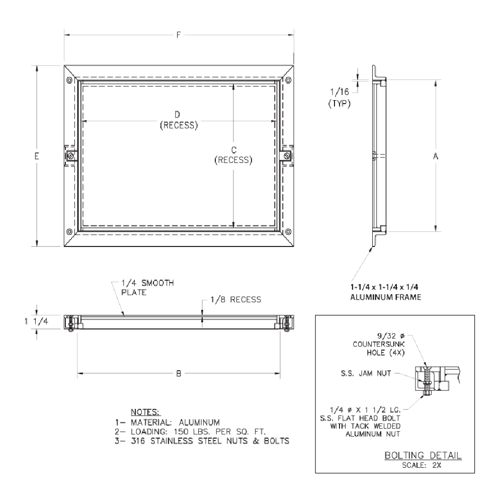 1/4 “reinforced smooth aluminum plate for 150 lb/ft. live load2, recessed 1/8” for mosaic/vinyl carpet