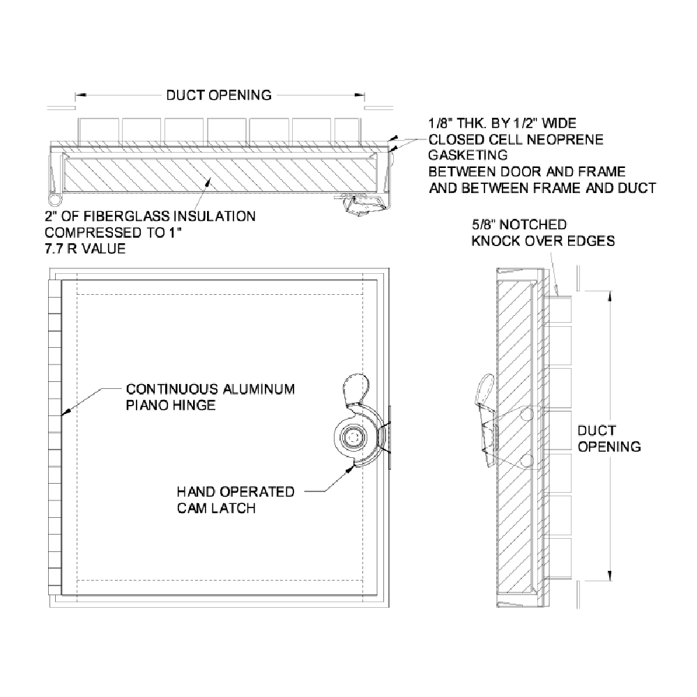 1/8 “thick by 1/2” wide closed-cell neoprene gaskets between door and frame and also between frame and duct