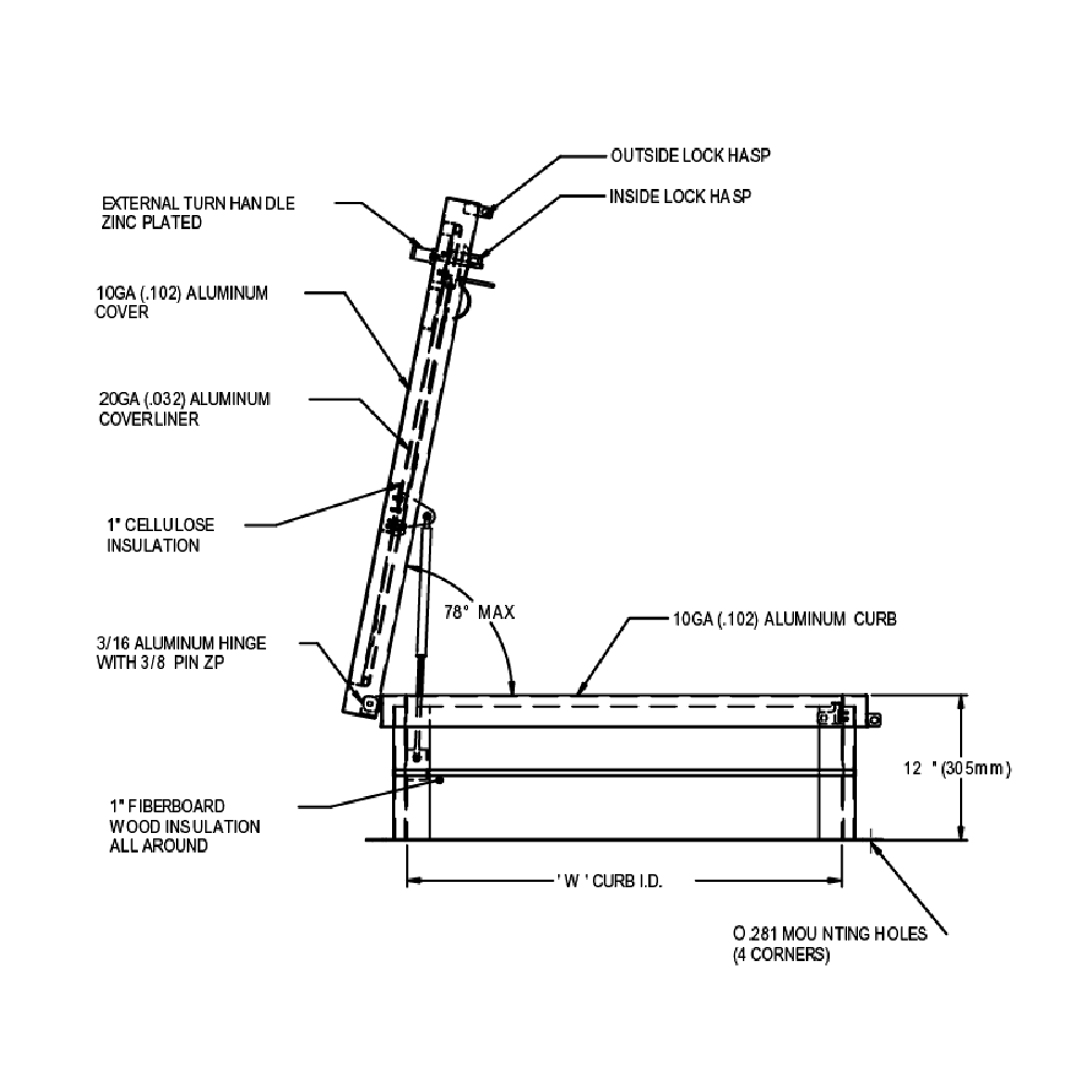 Dual deck construction (“boxed type design”) with 1″ Polyiso (R-6) insulation and continuous EPDM foam reinforcement/weather seal packing that bonds to the inside of the deck to provide a flush and tight fit. Designed to support a live load of 40lb/ft2; The cover is 10-gauge aluminum with 20-gauge aluminum inside the interior lining.