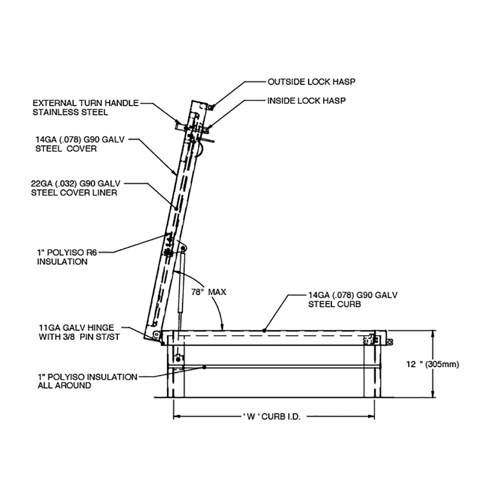 Dual-deck construction (“boxed type design”) with 1″ Polyiso (R-6) insulation and continuous EPDM foam reinforcement/weather seal packaging that bonds to the inside of the deck to provide a flush, tight fit. Designed to support a live load of 40lb/ft2; The deck is 14-gauge galvanized steel with 22-gauge galvanized steel inside the interior lining.