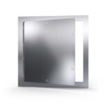 12 gauge level mounting door and frame with rounded corner frame and reinforced panel. One-piece outer flange welded to the mounting frame