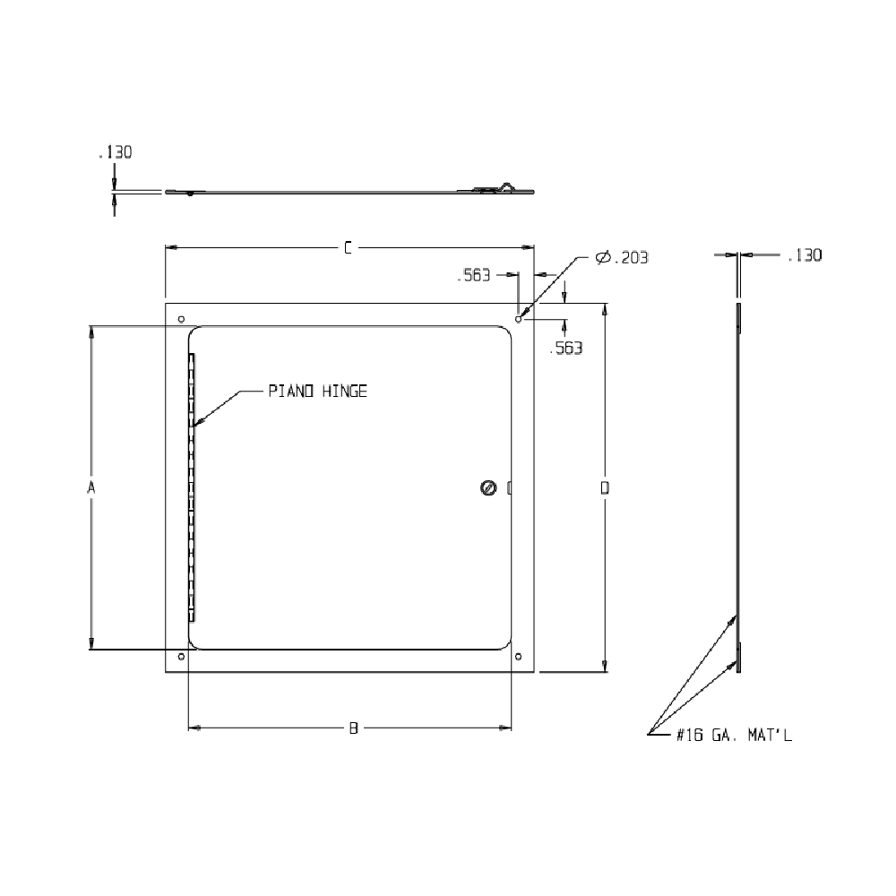 Steel: 16 gauge, level with the frame with rounded safety corners and one-piece outer flange. The frame is a one-piece outer flange