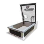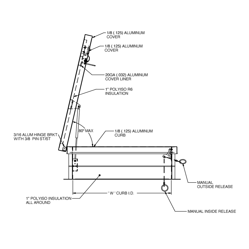 Dual shell construction (“type inside box design”) with 1 “cellulose insulation and weather seal packaging/continuous EPDM foam reinforcement that bonds to the inside of the deck to provide a flush and tight fit. Designed to support a live load of 40lb/ft2; The cover is 1/8” thick aluminum with 20 gauge aluminum interior lining.
