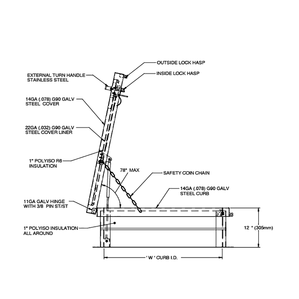 Dual deck construction (“boxed type design”) with 1″ Polyiso (R-6) insulation and continuous EPDM foam reinforcement/weather seal packing that bonds to the inside of the deck to provide a flush and tight fit. Designed to support a live load of 40lb/ft2; The deck is 14-gauge galvanized steel with 22-gauge galvanized steel inside the interior lining.