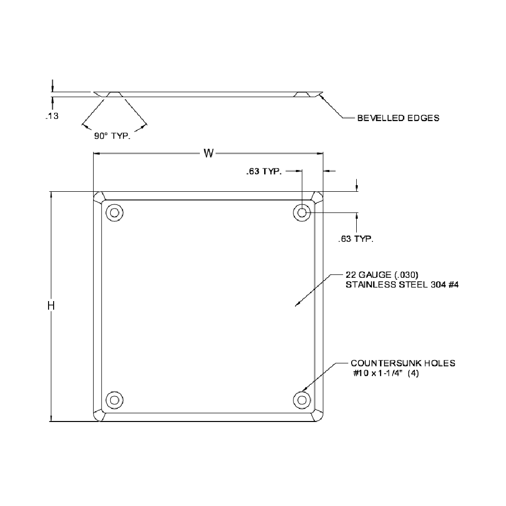 Square, beveled edges and rounded corners with countersunk holes in each corner for installation screws. 4 Pcs X Stainless Steel #10 x 1.250″ Oval Head Square Thread Screws Included
