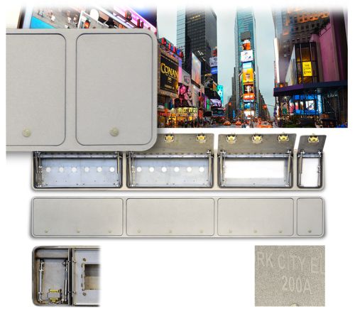 Ces portes sont livrées pour être installées dans des bancs de granit à usage public à Times Square, NY. Les bancs vont de 25 pieds à 65 pieds de longueur, chacun ayant des cavités sur la face arrière pour loger les systèmes électriques, de diffusion et de contrôle des données.