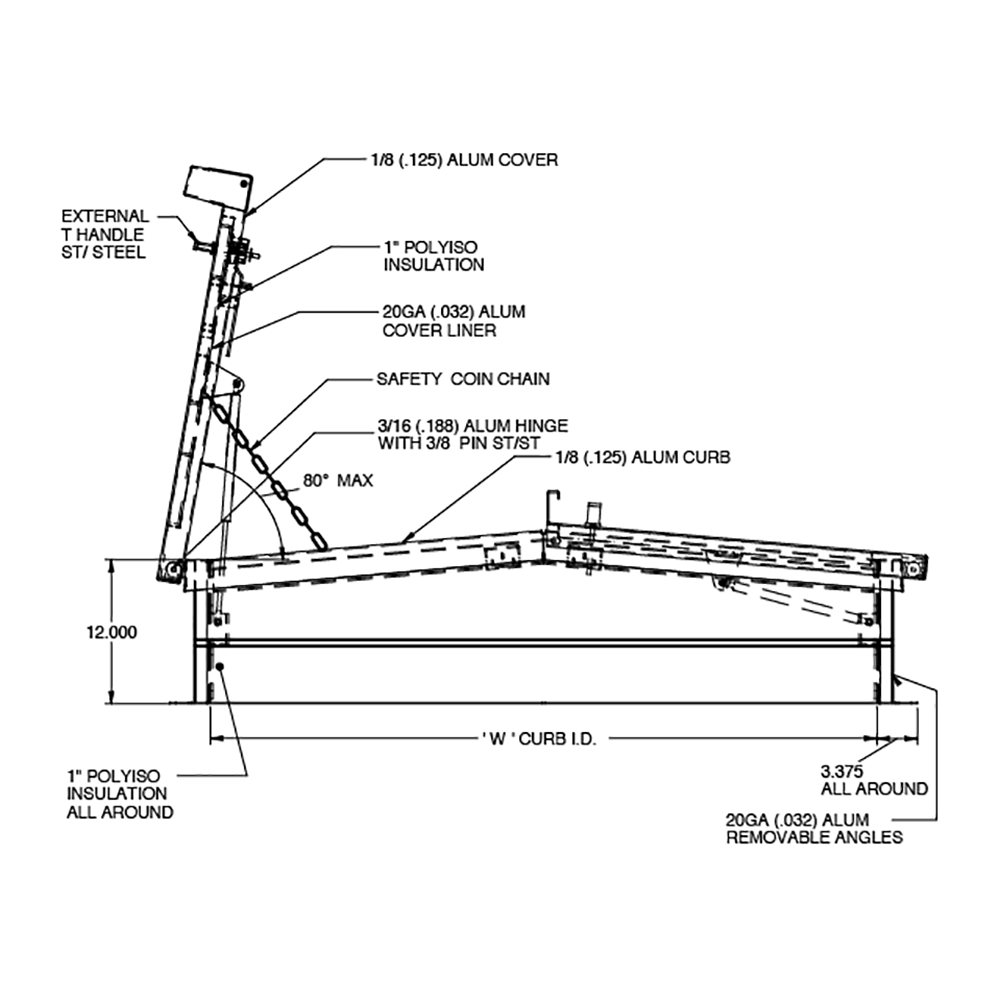 Construcción de doble cubierta («diseño tipo dentro de caja») con aislante Polyiso (R-6) de 1″ y empaque de sello de clima/refuerzo de espuma EPDM continuo que se une al interior de la cubierta para proporcionar un ajuste al ras y apretado. Diseñado para soportar una carga viva de 40 lb/pie2; la cubierta es de aluminio de 1/8″ de espesor con revestimiento interior de aluminio calibre 20.