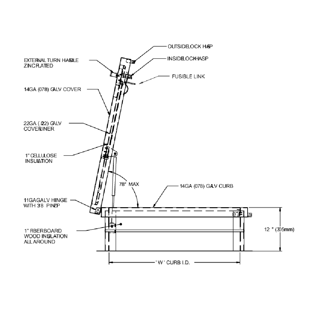Construcción de doble cubierta («diseño tipo dentro de caja») con aislante de celulosa de 1″ y empaque de sello de clima / refuerzo de espuma EPDM continuo que se une al interior de la cubierta para proporcionar un ajuste al ras y apretado. Diseñado para soportar una carga viva de 40lb/pie2; la cubierta es de acero galvanizado calibre 14 con acero galvanizado calibre 22 dentro del revestimiento interior.
